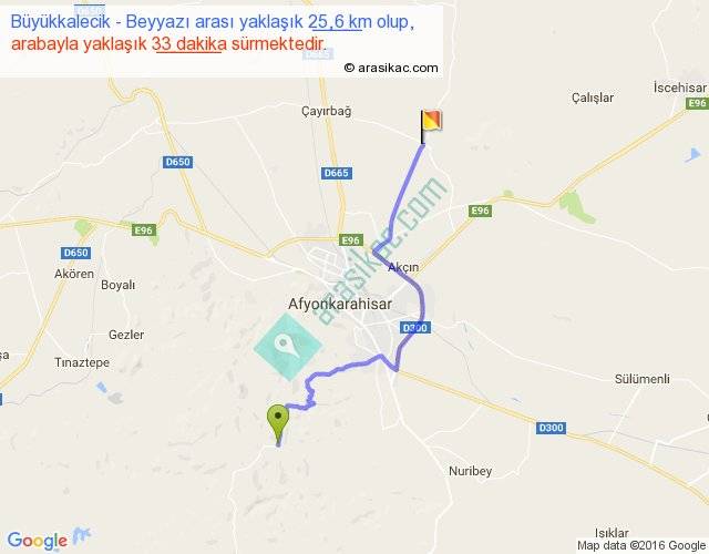 Büyükkalecik - Beyyazı arası yaklaşık olarak 90 km/h ile yukarıda belirtilen sürede olup, iki yerin kuş uçuşu uzaklığı (mesafesi) 18'dir. Yolculuk otobüsle 42 dakika sürmektedir.