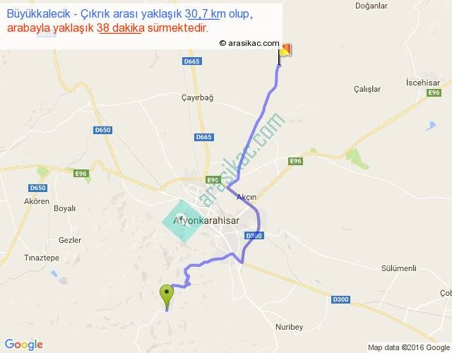 Büyükkalecik - Çıkrık arası yaklaşık olarak 90 km/h ile yukarıda belirtilen sürede olup, iki yerin kuş uçuşu uzaklığı (mesafesi) 23'dir. Yolculuk otobüsle 49 dakika sürmektedir.