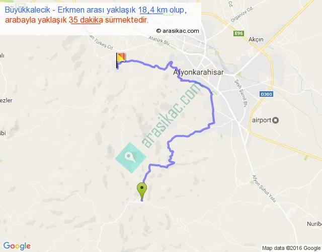 Büyükkalecik - Erkmen arası yaklaşık olarak 90 km/h ile yukarıda belirtilen sürede olup, iki yerin kuş uçuşu uzaklığı (mesafesi) 8'dir. Yolculuk otobüsle 45 dakika sürmektedir.