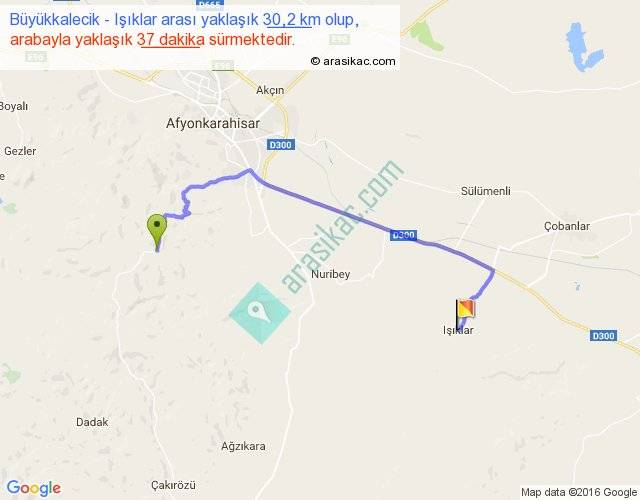 Büyükkalecik - Işıklar arası yaklaşık olarak 90 km/h ile yukarıda belirtilen sürede olup, iki yerin kuş uçuşu uzaklığı (mesafesi) 18'dir. Yolculuk otobüsle 48 dakika sürmektedir.