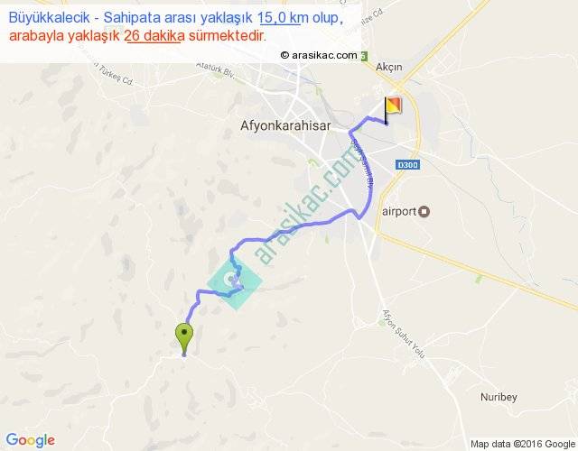 Büyükkalecik - Sahipata arası yaklaşık olarak 90 km/h ile yukarıda belirtilen sürede olup, iki yerin kuş uçuşu uzaklığı (mesafesi) 10'dir. Yolculuk otobüsle 33 dakika sürmektedir.