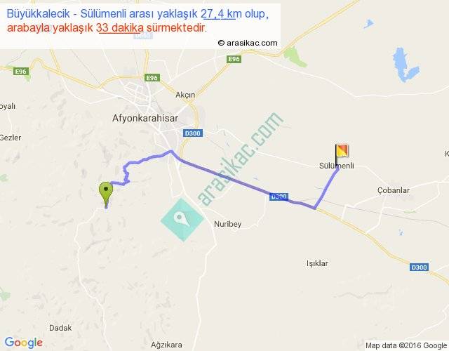 Büyükkalecik - Sülümenli arası yaklaşık olarak 90 km/h ile yukarıda belirtilen sürede olup, iki yerin kuş uçuşu uzaklığı (mesafesi) 20'dir. Yolculuk otobüsle 42 dakika sürmektedir.