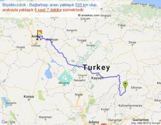 Büyükkızılcık - Bağlarbaşı arası yaklaşık olarak 90 km/h ile yukarıda belirtilen sürede olup, iki yerin kuş uçuşu uzaklığı (mesafesi) 383'dir. Eğer belirtilen yerler arasında uçak seferi var ise bu süre uçakla 35 dakika'ya kadar düşebilir. Yolculuk otobüsle 7 saat 57 dakika sürmektedir.