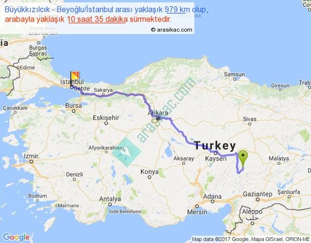 Büyükkızılcık - Beyoğlu İstanbul arası yaklaşık olarak 90 km/h ile yukarıda belirtilen sürede olup, iki yerin kuş uçuşu uzaklığı (mesafesi) 729'dir. Eğer belirtilen yerler arasında uçak seferi var ise bu süre uçakla 1 saat 07 dakika'ya kadar düşebilir. Yolculuk otobüsle 13 saat 45 dakika sürmektedir.