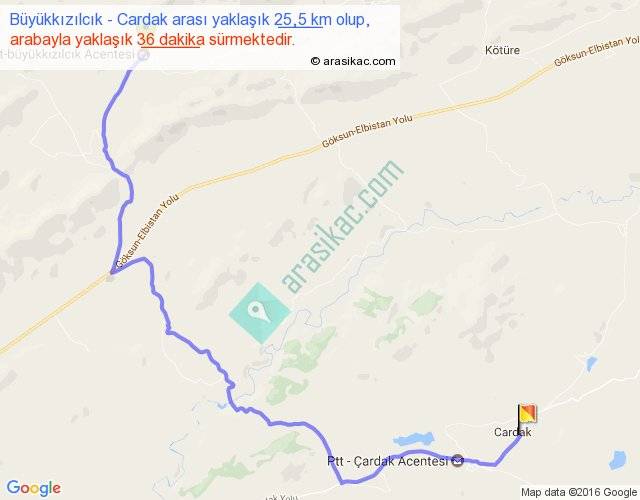 Büyükkızılcık - Cardak arası yaklaşık olarak 90 km/h ile yukarıda belirtilen sürede olup, iki yerin kuş uçuşu uzaklığı (mesafesi) 16'dir. Yolculuk otobüsle 46 dakika sürmektedir.