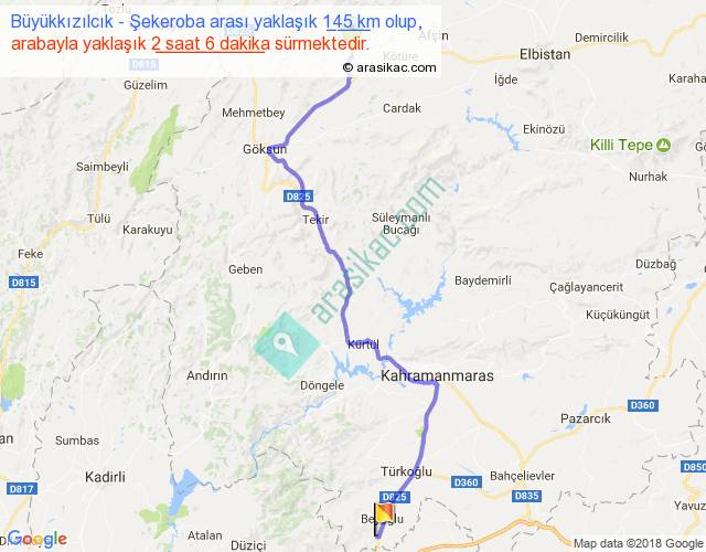 Büyükkızılcık - Şekeroba arası yaklaşık olarak 90 km/h ile yukarıda belirtilen sürede olup, iki yerin kuş uçuşu uzaklığı (mesafesi) 105'dir. Yolculuk otobüsle 2 saat 43 dakika sürmektedir.