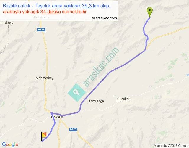 Büyükkızılcık - Taşoluk arası yaklaşık olarak 90 km/h ile yukarıda belirtilen sürede olup, iki yerin kuş uçuşu uzaklığı (mesafesi) 33'dir. Yolculuk otobüsle 44 dakika sürmektedir.
