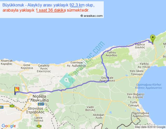 Büyükkonuk - Alayköy arası yaklaşık olarak 90 km/h ile yukarıda belirtilen sürede olup, iki yerin kuş uçuşu uzaklığı (mesafesi) 70'dir. Yolculuk otobüsle 2 saat 4 dakika sürmektedir.