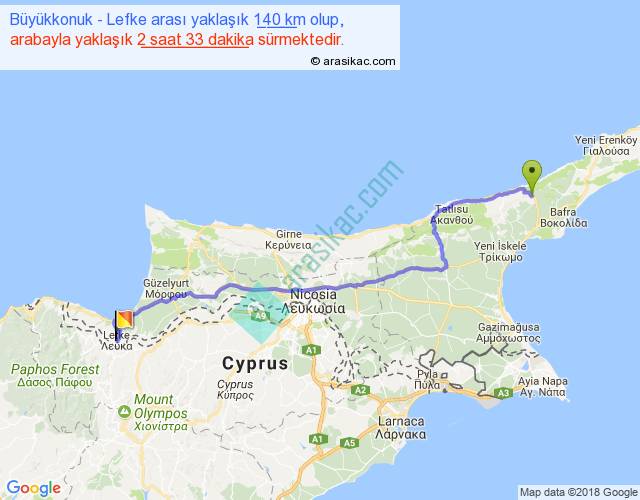 Büyükkonuk - Lefke arası yaklaşık olarak 90 km/h ile yukarıda belirtilen sürede olup, iki yerin kuş uçuşu uzaklığı (mesafesi) 109'dir. Yolculuk otobüsle 3 saat 18 dakika sürmektedir.