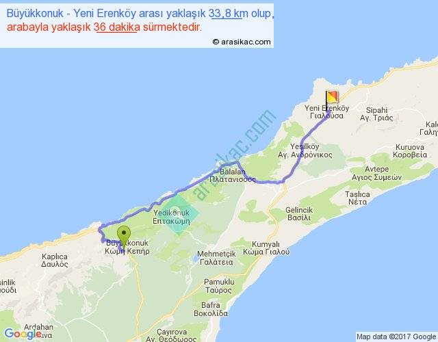 Büyükkonuk - Yeni Erenköy arası yaklaşık olarak 90 km/h ile yukarıda belirtilen sürede olup, iki yerin kuş uçuşu uzaklığı (mesafesi) 22'dir. Yolculuk otobüsle 46 dakika sürmektedir.