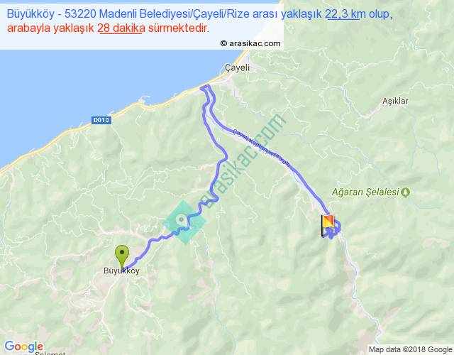 Büyükköy - 53220 Madenli Belediyesi Çayeli Rize arası yaklaşık olarak 90 km/h ile yukarıda belirtilen sürede olup, iki yerin kuş uçuşu uzaklığı (mesafesi) 8'dir. Yolculuk otobüsle 36 dakika sürmektedir.