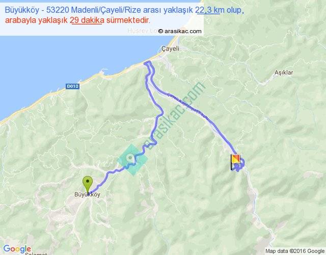 Büyükköy - 53220 Madenli Çayeli Rize arası yaklaşık olarak 90 km/h ile yukarıda belirtilen sürede olup, iki yerin kuş uçuşu uzaklığı (mesafesi) 8'dir. Yolculuk otobüsle 37 dakika sürmektedir.
