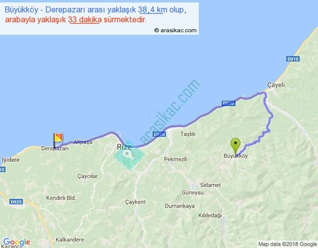 Büyükköy - Derepazarı arası yaklaşık olarak 90 km/h ile yukarıda belirtilen sürede olup, iki yerin kuş uçuşu uzaklığı (mesafesi) 21'dir. Yolculuk otobüsle 42 dakika sürmektedir.