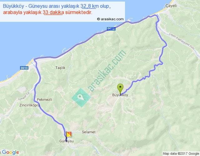 Büyükköy - Güneysu arası yaklaşık olarak 90 km/h ile yukarıda belirtilen sürede olup, iki yerin kuş uçuşu uzaklığı (mesafesi) 6'dir. Yolculuk otobüsle 42 dakika sürmektedir.