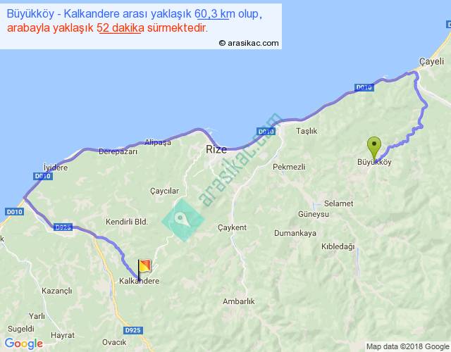 Büyükköy - Kalkandere arası yaklaşık olarak 90 km/h ile yukarıda belirtilen sürede olup, iki yerin kuş uçuşu uzaklığı (mesafesi) 21'dir. Yolculuk otobüsle 1 saat 7 dakika sürmektedir.