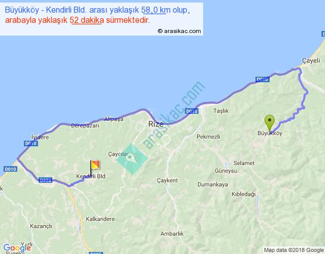 Büyükköy - Kendirli Bld. arası yaklaşık olarak 90 km/h ile yukarıda belirtilen sürede olup, iki yerin kuş uçuşu uzaklığı (mesafesi) 21'dir. Yolculuk otobüsle 1 saat 7 dakika sürmektedir.
