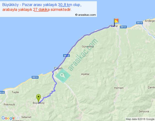 Büyükköy - Pazar arası yaklaşık olarak 90 km/h ile yukarıda belirtilen sürede olup, iki yerin kuş uçuşu uzaklığı (mesafesi) 26'dir. Yolculuk otobüsle 35 dakika sürmektedir.