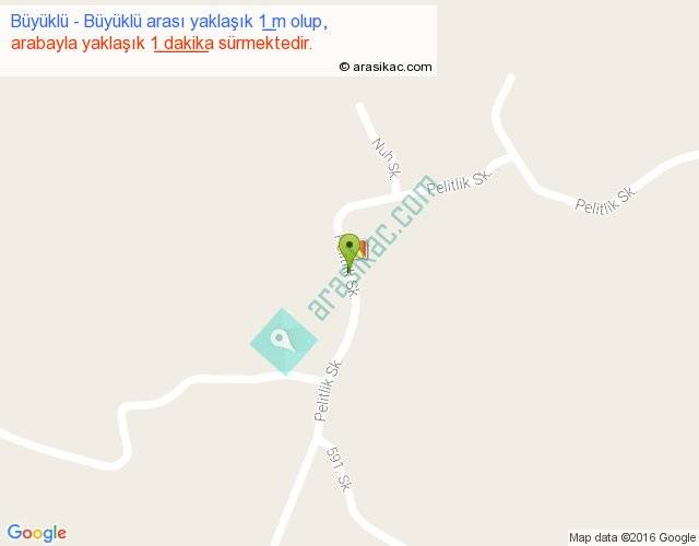 Büyüklü - Büyüklü arası yaklaşık olarak 90 km/h ile yukarıda belirtilen sürede olup, iki yerin kuş uçuşu uzaklığı (mesafesi) 0'dir. Yolculuk otobüsle 1 dakika sürmektedir.