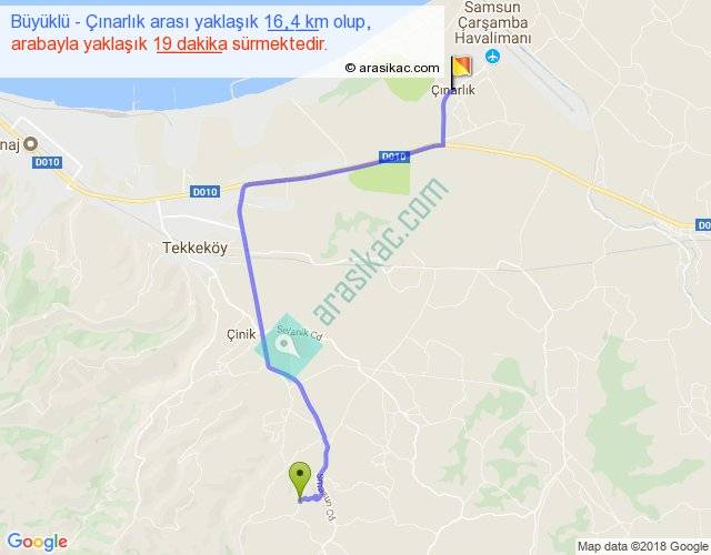 Büyüklü - Çınarlık arası yaklaşık olarak 90 km/h ile yukarıda belirtilen sürede olup, iki yerin kuş uçuşu uzaklığı (mesafesi) 11'dir. Yolculuk otobüsle 24 dakika sürmektedir.