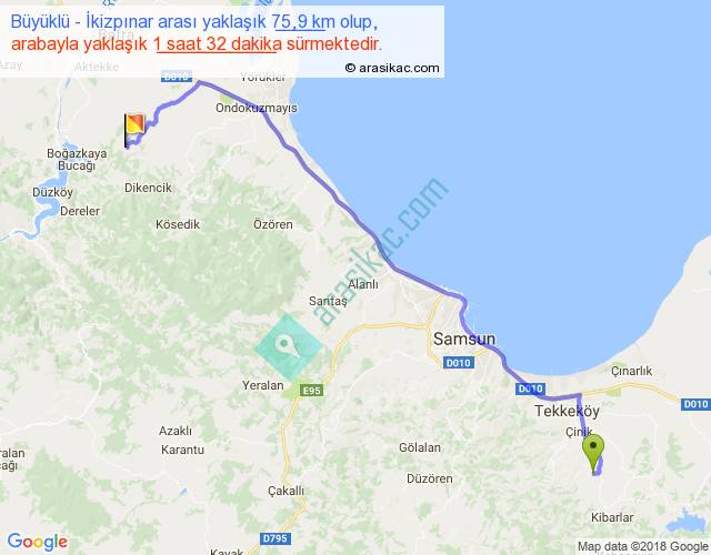Büyüklü - İkizpınar arası yaklaşık olarak 90 km/h ile yukarıda belirtilen sürede olup, iki yerin kuş uçuşu uzaklığı (mesafesi) 58'dir. Yolculuk otobüsle 1 saat 59 dakika sürmektedir.
