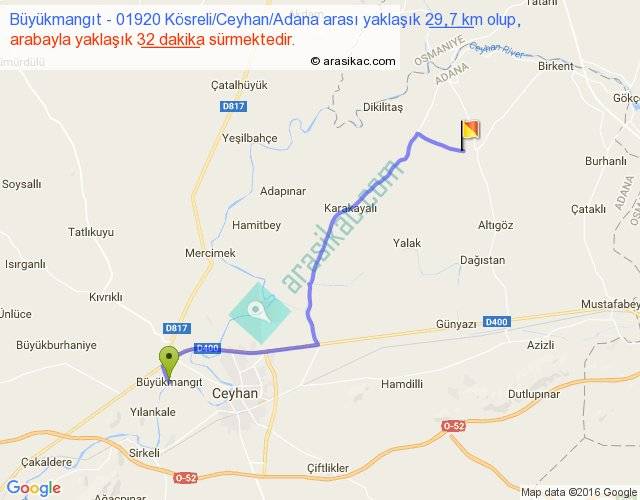 Büyükmangıt - 01920 Kösreli Ceyhan Adana arası yaklaşık olarak 90 km/h ile yukarıda belirtilen sürede olup, iki yerin kuş uçuşu uzaklığı (mesafesi) 23'dir. Yolculuk otobüsle 41 dakika sürmektedir.