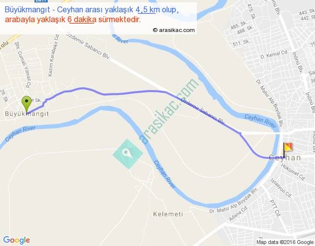 Büyükmangıt - Ceyhan arası yaklaşık olarak 90 km/h ile yukarıda belirtilen sürede olup, iki yerin kuş uçuşu uzaklığı (mesafesi) 4'dir. Yolculuk otobüsle 7 dakika sürmektedir.