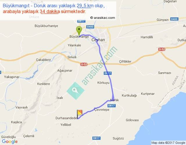 Büyükmangıt - Doruk arası yaklaşık olarak 90 km/h ile yukarıda belirtilen sürede olup, iki yerin kuş uçuşu uzaklığı (mesafesi) 17'dir. Yolculuk otobüsle 44 dakika sürmektedir.