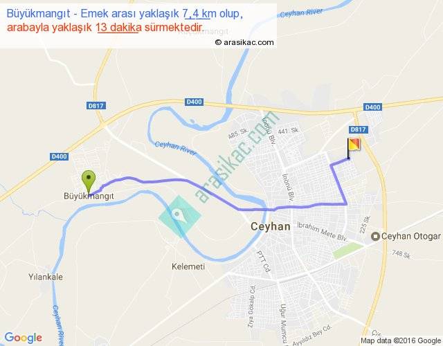 Büyükmangıt - Emek arası yaklaşık olarak 90 km/h ile yukarıda belirtilen sürede olup, iki yerin kuş uçuşu uzaklığı (mesafesi) 6'dir. Yolculuk otobüsle 16 dakika sürmektedir.