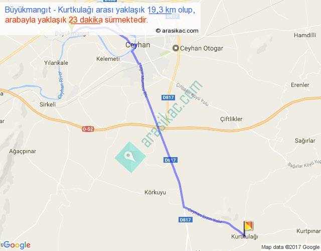 Büyükmangıt - Kurtkulağı arası yaklaşık olarak 90 km/h ile yukarıda belirtilen sürede olup, iki yerin kuş uçuşu uzaklığı (mesafesi) 16'dir. Yolculuk otobüsle 29 dakika sürmektedir.