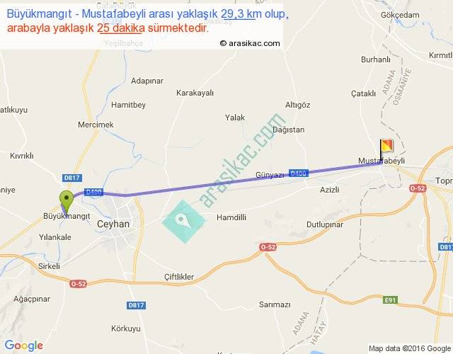 Büyükmangıt - Mustafabeyli arası yaklaşık olarak 90 km/h ile yukarıda belirtilen sürede olup, iki yerin kuş uçuşu uzaklığı (mesafesi) 27'dir. Yolculuk otobüsle 32 dakika sürmektedir.