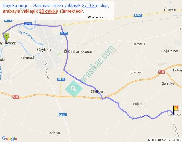 Büyükmangıt - Sarımazı arası yaklaşık olarak 90 km/h ile yukarıda belirtilen sürede olup, iki yerin kuş uçuşu uzaklığı (mesafesi) 19'dir. Yolculuk otobüsle 36 dakika sürmektedir.