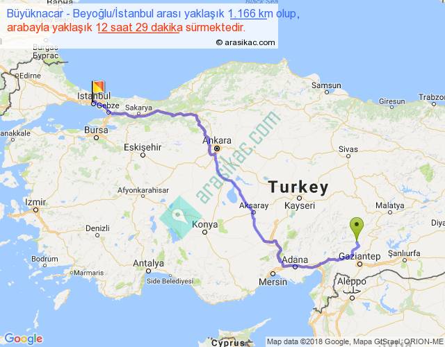 Büyüknacar - Beyoğlu İstanbul arası yaklaşık olarak 90 km/h ile yukarıda belirtilen sürede olup, iki yerin kuş uçuşu uzaklığı (mesafesi) 805'dir. Eğer belirtilen yerler arasında uçak seferi var ise bu süre uçakla 1 saat 14 dakika'ya kadar düşebilir. Yolculuk otobüsle 16 saat 13 dakika sürmektedir.