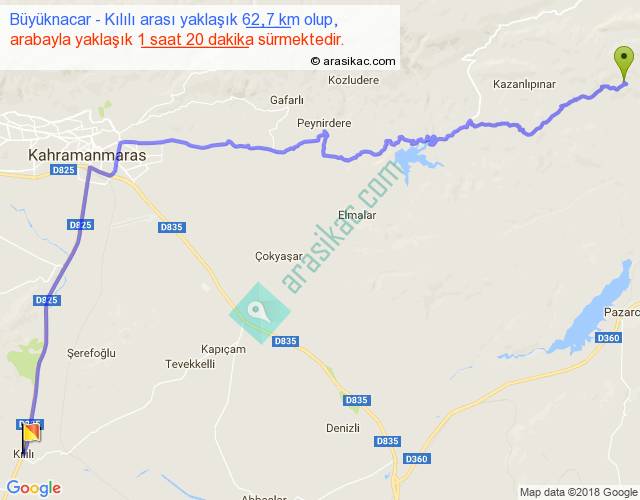 Büyüknacar - Kılılı arası yaklaşık olarak 90 km/h ile yukarıda belirtilen sürede olup, iki yerin kuş uçuşu uzaklığı (mesafesi) 42'dir. Yolculuk otobüsle 1 saat 44 dakika sürmektedir.