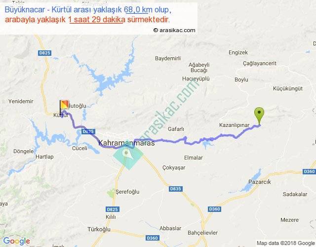 Büyüknacar - Kürtül arası yaklaşık olarak 90 km/h ile yukarıda belirtilen sürede olup, iki yerin kuş uçuşu uzaklığı (mesafesi) 48'dir. Yolculuk otobüsle 1 saat 55 dakika sürmektedir.