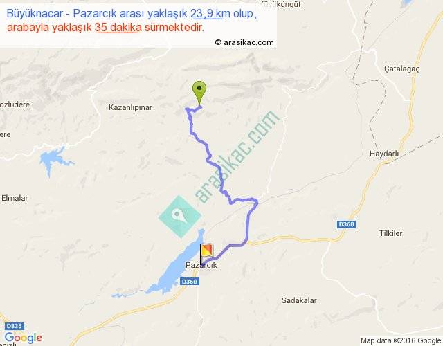 Büyüknacar - Pazarcık arası yaklaşık olarak 90 km/h ile yukarıda belirtilen sürede olup, iki yerin kuş uçuşu uzaklığı (mesafesi) 14'dir. Yolculuk otobüsle 45 dakika sürmektedir.