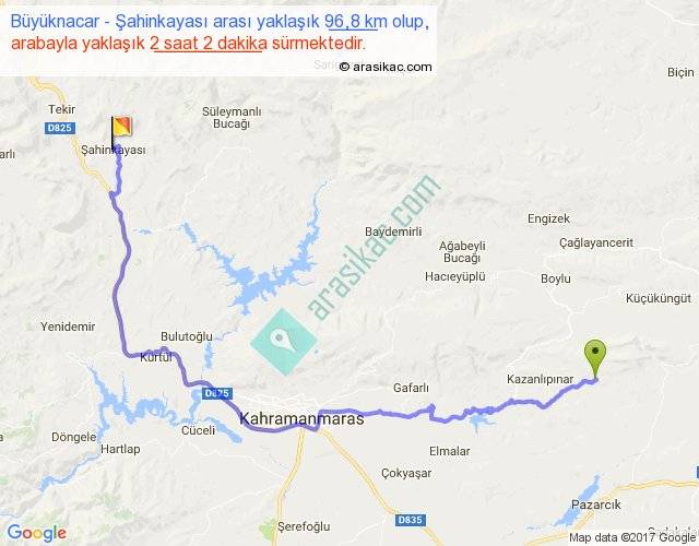 Büyüknacar - Şahinkayası arası yaklaşık olarak 90 km/h ile yukarıda belirtilen sürede olup, iki yerin kuş uçuşu uzaklığı (mesafesi) 59'dir. Yolculuk otobüsle 2 saat 38 dakika sürmektedir.