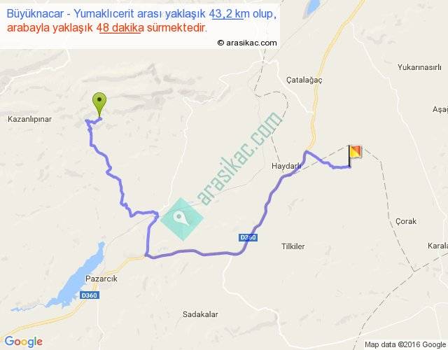 Büyüknacar - Yumaklıcerit arası yaklaşık olarak 90 km/h ile yukarıda belirtilen sürede olup, iki yerin kuş uçuşu uzaklığı (mesafesi) 22'dir. Yolculuk otobüsle 1 saat 2 dakika sürmektedir.