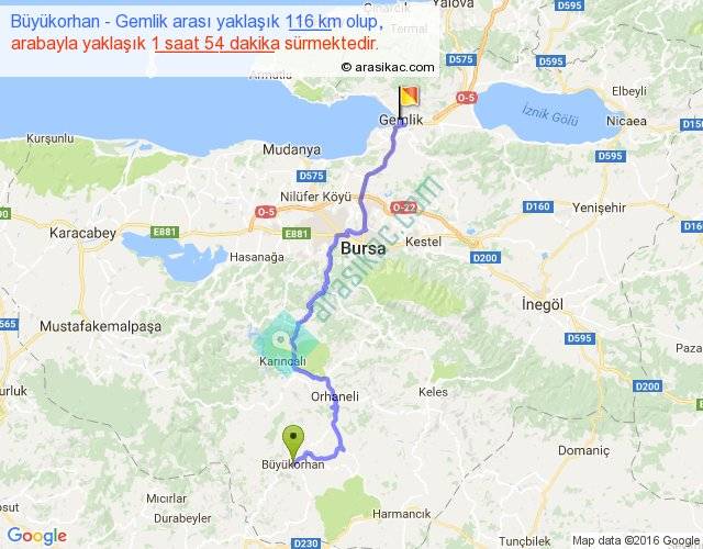 Büyükorhan - Gemlik arası yaklaşık olarak 90 km/h ile yukarıda belirtilen sürede olup, iki yerin kuş uçuşu uzaklığı (mesafesi) 76'dir. Yolculuk otobüsle 2 saat 28 dakika sürmektedir.