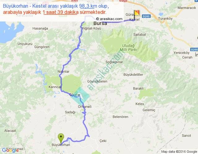 Büyükorhan - Kestel arası yaklaşık olarak 90 km/h ile yukarıda belirtilen sürede olup, iki yerin kuş uçuşu uzaklığı (mesafesi) 55'dir. Yolculuk otobüsle 2 saat 8 dakika sürmektedir.