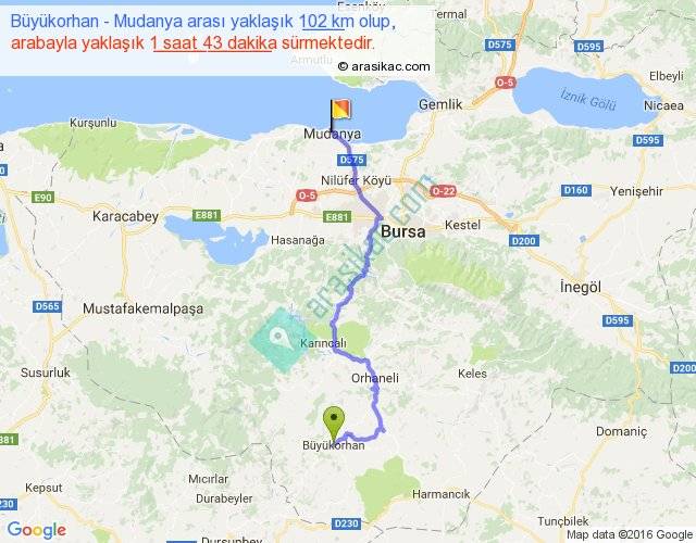 Büyükorhan - Mudanya arası yaklaşık olarak 90 km/h ile yukarıda belirtilen sürede olup, iki yerin kuş uçuşu uzaklığı (mesafesi) 67'dir. Yolculuk otobüsle 2 saat 13 dakika sürmektedir.