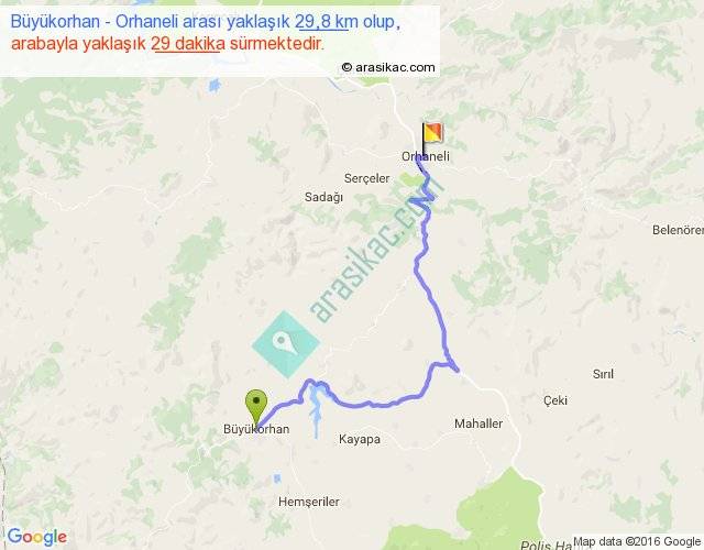 Büyükorhan - Orhaneli arası yaklaşık olarak 90 km/h ile yukarıda belirtilen sürede olup, iki yerin kuş uçuşu uzaklığı (mesafesi) 17'dir. Yolculuk otobüsle 37 dakika sürmektedir.
