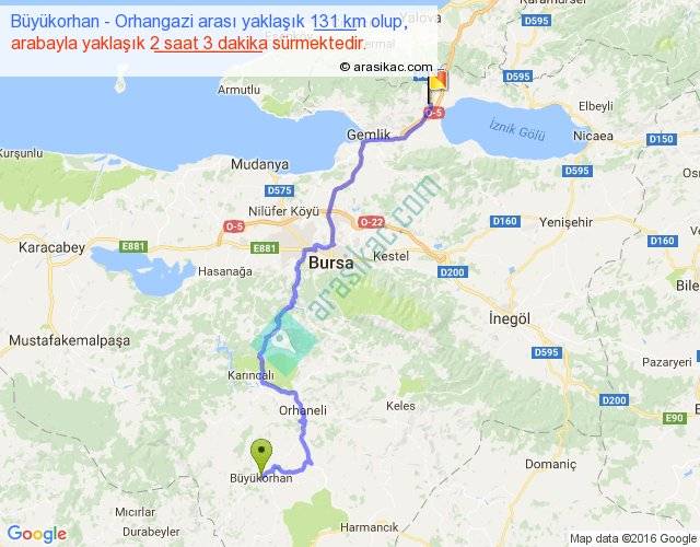 Büyükorhan - Orhangazi arası yaklaşık olarak 90 km/h ile yukarıda belirtilen sürede olup, iki yerin kuş uçuşu uzaklığı (mesafesi) 87'dir. Yolculuk otobüsle 2 saat 39 dakika sürmektedir.
