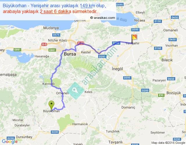 Büyükorhan - Yenişehir arası yaklaşık olarak 90 km/h ile yukarıda belirtilen sürede olup, iki yerin kuş uçuşu uzaklığı (mesafesi) 85'dir. Yolculuk otobüsle 2 saat 43 dakika sürmektedir.