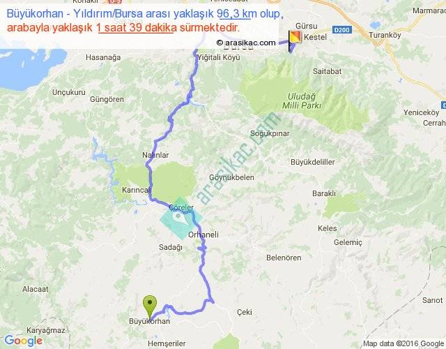 Büyükorhan - Yıldırım Bursa arası yaklaşık olarak 90 km/h ile yukarıda belirtilen sürede olup, iki yerin kuş uçuşu uzaklığı (mesafesi) 51'dir. Yolculuk otobüsle 2 saat 8 dakika sürmektedir.
