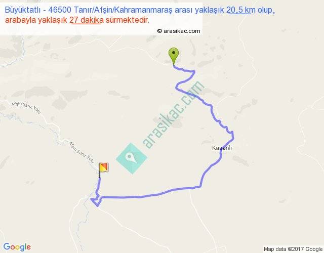 Büyüktatlı - 46500 Tanır Afşin Kahramanmaraş arası yaklaşık olarak 90 km/h ile yukarıda belirtilen sürede olup, iki yerin kuş uçuşu uzaklığı (mesafesi) 8'dir. Yolculuk otobüsle 35 dakika sürmektedir.