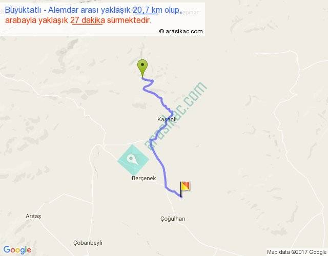 Büyüktatlı - Alemdar arası yaklaşık olarak 90 km/h ile yukarıda belirtilen sürede olup, iki yerin kuş uçuşu uzaklığı (mesafesi) 15'dir. Yolculuk otobüsle 35 dakika sürmektedir.