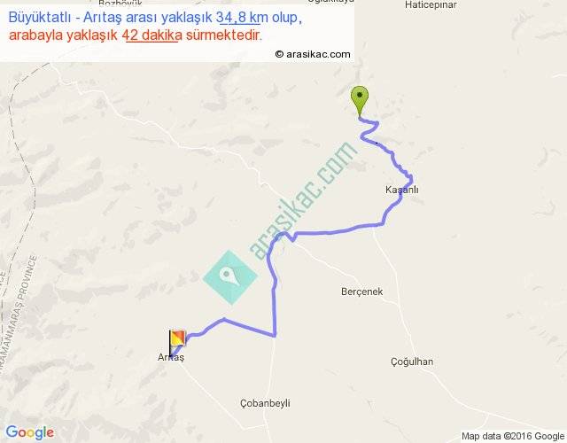 Büyüktatlı - Arıtaş arası yaklaşık olarak 90 km/h ile yukarıda belirtilen sürede olup, iki yerin kuş uçuşu uzaklığı (mesafesi) 20'dir. Yolculuk otobüsle 54 dakika sürmektedir.