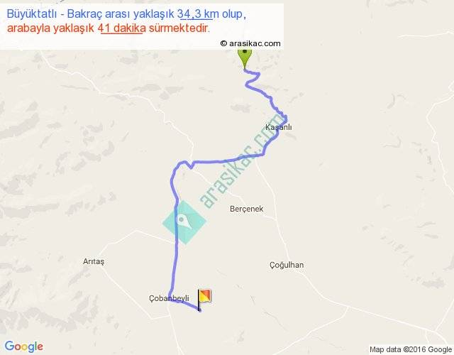 Büyüktatlı - Bakraç arası yaklaşık olarak 90 km/h ile yukarıda belirtilen sürede olup, iki yerin kuş uçuşu uzaklığı (mesafesi) 21'dir. Yolculuk otobüsle 53 dakika sürmektedir.