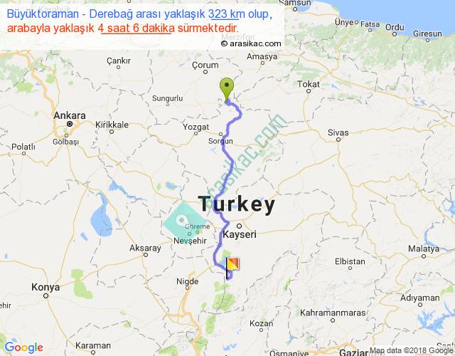 Büyüktoraman - Derebağ arası yaklaşık olarak 90 km/h ile yukarıda belirtilen sürede olup, iki yerin kuş uçuşu uzaklığı (mesafesi) 233'dir. Yolculuk otobüsle 5 saat 19 dakika sürmektedir.