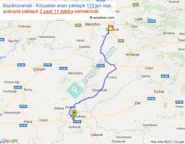 Büyüktoraman - Kılıçaslan arası yaklaşık olarak 90 km/h ile yukarıda belirtilen sürede olup, iki yerin kuş uçuşu uzaklığı (mesafesi) 74'dir. Yolculuk otobüsle 2 saat 50 dakika sürmektedir.